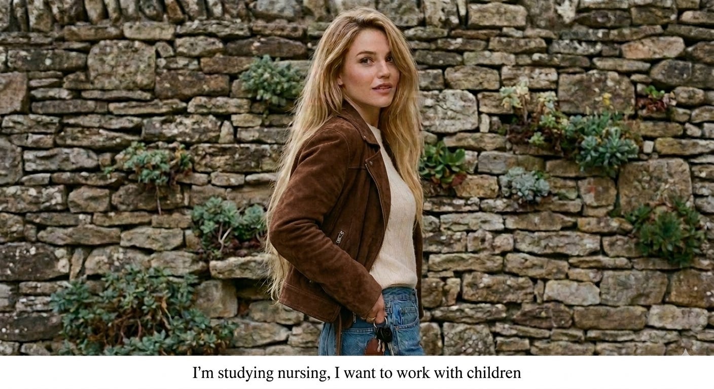 And she is lovely. She is morning dew on mountain flowers: soft luminous skin with a blush like a white-peach; thick blonde hair like the women in those shampoo commercials from the 1970’s, running through a pasture in the summer sun. It’s fall, she’s not wearing one of those cotton flowered summer dresses, she’s got a brown suede jacket, white cashmere sweater and bluejeans. I can’t remember her shoes, but I’m sure they were not Jimmy Choos.